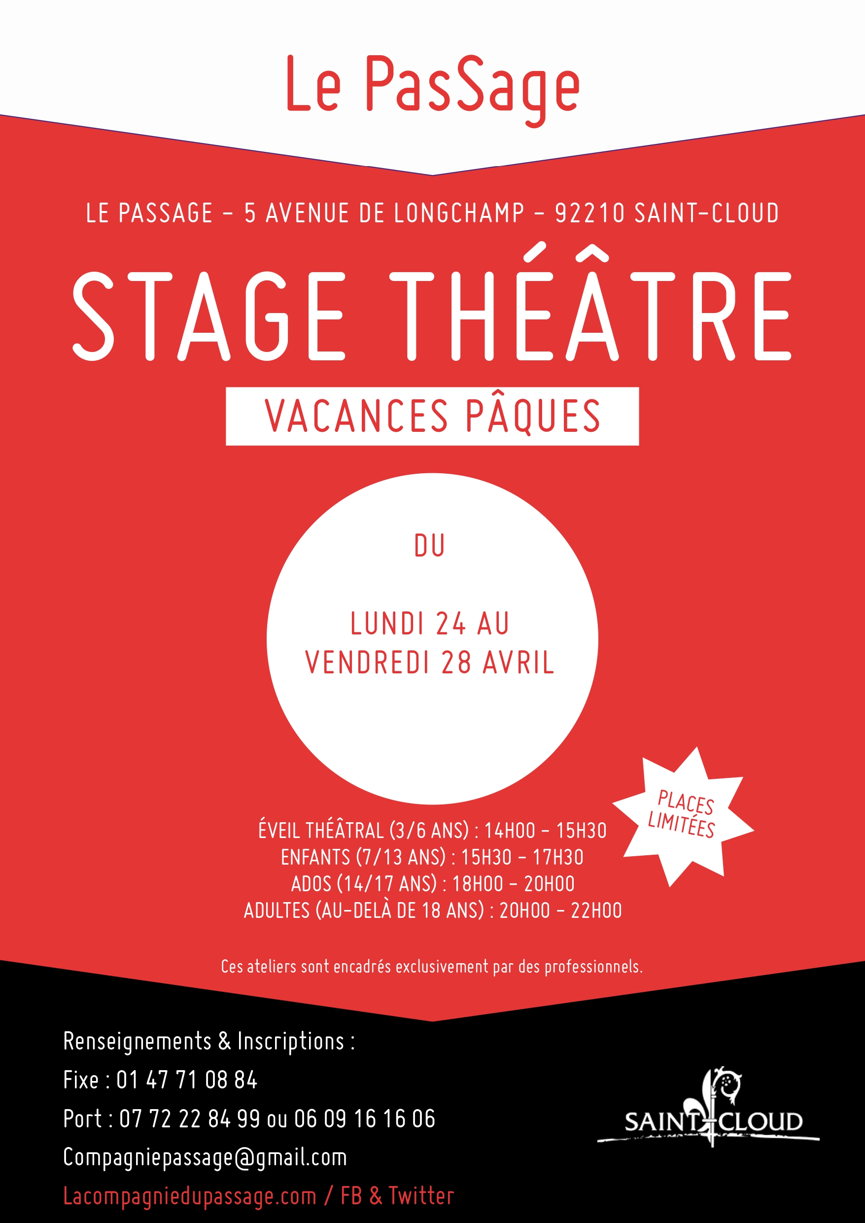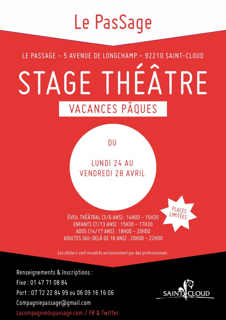 Il vous reste encore un peu plus de deux semaines pour vous inscrire à nos stages de théâtre de PRINTEMPS, qui auront lieu durant la première semaine des vacances scolaires, soit du lundi 24 au vendredi 28 avril.