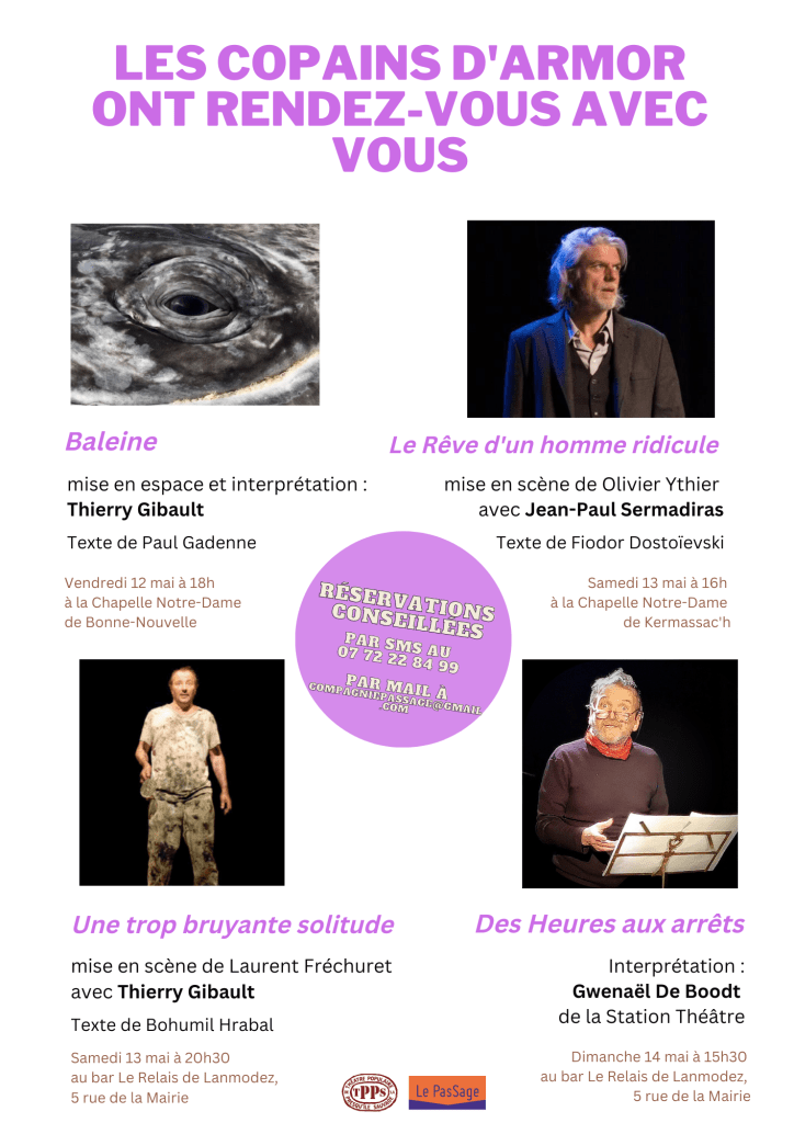- Vendredi 12 mai à 18h nous avons le plaisir de vous présenter Baleine d’après la nouvelle de Paul Gadenne, mis en scène et interprété par Thierry Gibault à la Chapelle Notre-Dame de Bonne-Nouvelle, à Lanmodez.