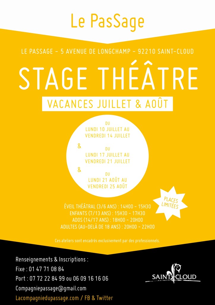Il est désormais possible de vous inscrire à nos stages de théâtre d’ÉTÉ, qui auront lieu du lundi 10 au vendredi 14 juillet, du lundi 16 au vendredi 21 juillet et du lundi 21 au vendredi 25 août.