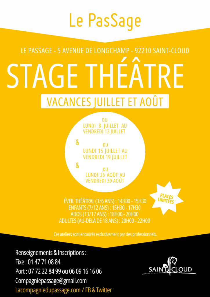 Il est désormais possible de vous inscrire à nos stages de théâtre d’ÉTÉ, qui auront lieu du lundi 8 au vendredi 12 juillet, du lundi 15 au vendredi 19 juillet et du lundi 26 au vendredi 30 août.