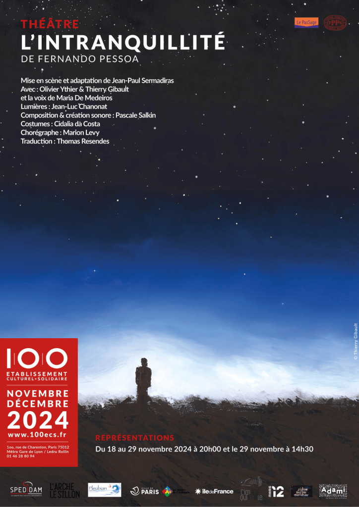 Nous vous proposons de venir découvrir notre adaptation du Livre de l’Intranquillité de Fernando Pessoa, mise en scène par Jean-Paul Sermadiras avec Thierry Gibault et Olivier Ythier (ainsi que la voix de Maria de Medeiros).
