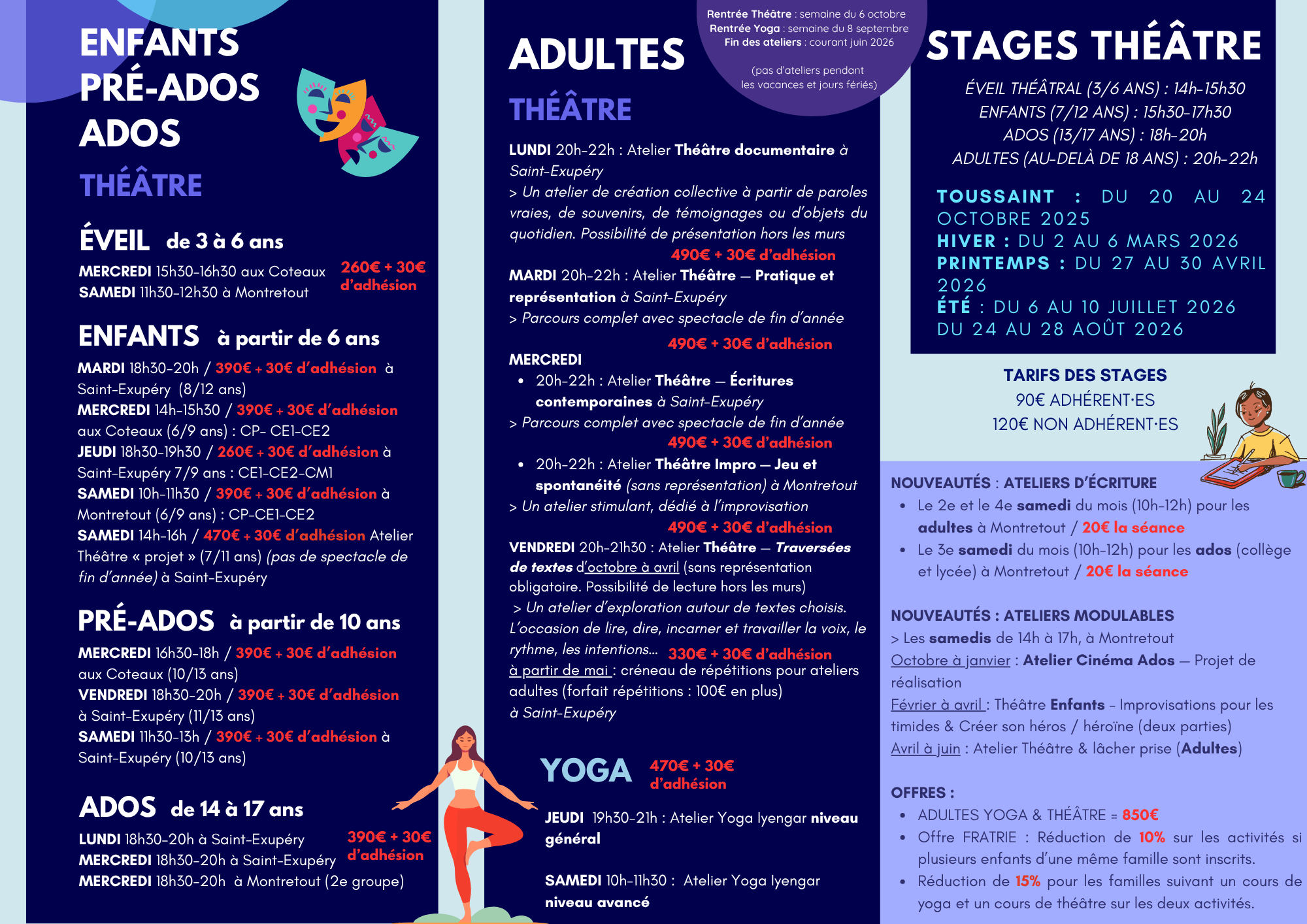 - Théâtre enfants (6–11 ans) : Mardi, Mercredi, Jeudi, Samedi