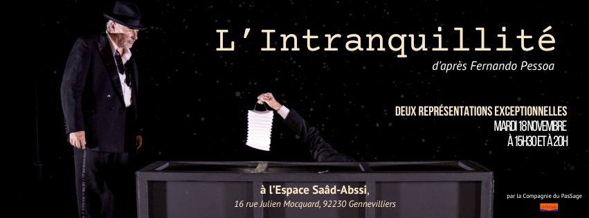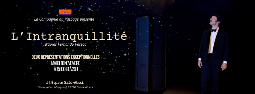 L’Intranquillité est une adaptation théâtrale du Livre de l’intranquillité de Fernando Pessoa, proposée par la Compagnie du PasSage. Le texte poétique et méditatif de Pessoa, attribué à son « semi-hétéronyme » Bernardo Soares, explore un univers intérieur fait de solitude, de rêves, de questionnements métaphysiques et de fragilité existentielle.
