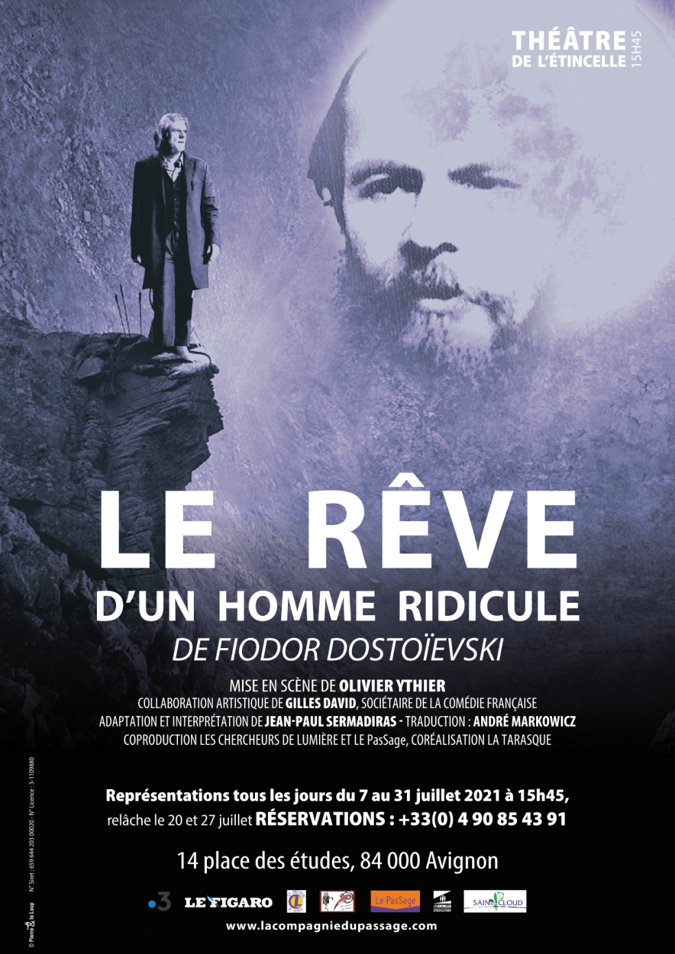 Le Festival d’Avignon approche et vous aurez l’occasion de nous y retrouver une nouvelle fois dans le Off pour notre pièce Le Rêve d’un homme ridicule de Fiodor Dostoïevski. Mise en scène : Olivier YthierCollaboration artistique : Gilles David, sociétaire de La Comédie Française Adaptation et interprétation : Jean-Paul Sermadiras Le Rêve d’un homme ridicule,… Lire la suite Venez rêver en Avignon du 7 au 31 juillet