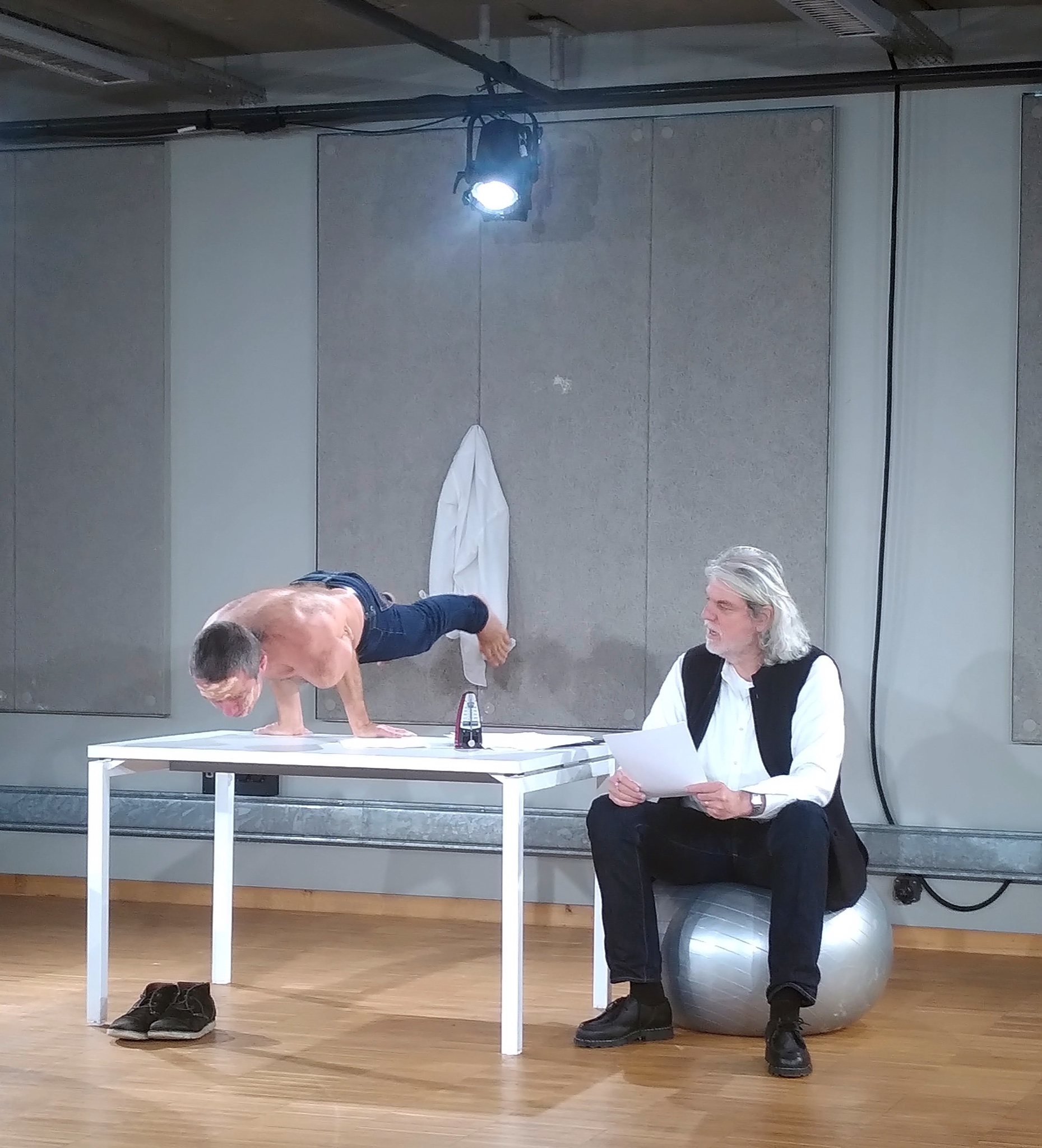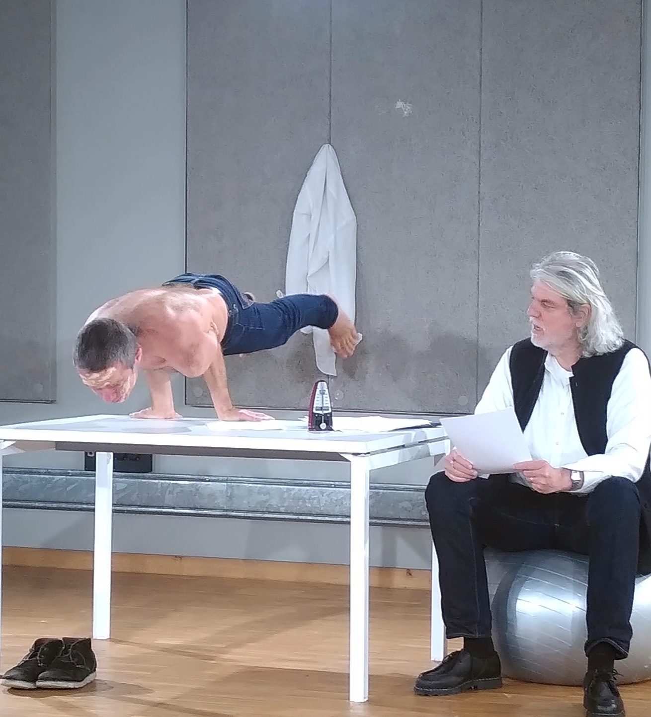 L’argument est simple : un homme en plein désarroi décide de renoncer à toute action, plus rien ne vaut la peine ! Son esprit et son corps en proie au doute et à la confusion se paralysent. C’est alors que s’engage avec son ami, une sorte de Jiminy Criquet humain, un dialogue alternant véhémence et humour. Quelques incroyables postures yoguiques ponctuent la métamorphose du désespéré, le corps cherche à comprendre lui aussi, il montre la voie : tête en bas, le regard inversé, ou tortue aux membres rétractés : il ne se laisse plus ensorceler par les illusions ni les conventions, mais relève le pari : sitôt qu’il choisit de vivre et d’agir, une nouvelle sève le fait courir et danser. Ce qu’il pensait impossible, il le réalisera pour le bien de tous. Les voix et les gestes de ces deux acteurs prodigieux déploient soudain à nos yeux un autre horizon.